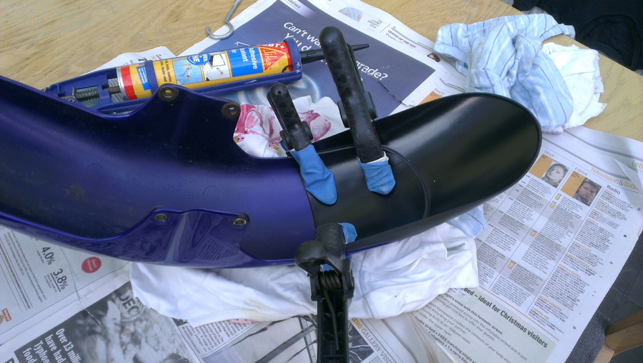 I really didn’t fancy drilling through my mudguard, so I binned the screws and opted for some glue. My tube of Tiger Seal had dried up, so I picked up some Sikaflex EBT glue from my local ScrewFix. Four bolts were removed and the mudguard came off easy peasy, which made it a damned sight easy to glean all the crud off and wipe it down with a spot of meths to ensure clean and grease-free surfaces for the glue to bond well with. Some big clips then held it well until the glue set. To stop the clips marking the mudguard I cut off the fingers of some old rubber gloves and stuck them over the ends. Classy.