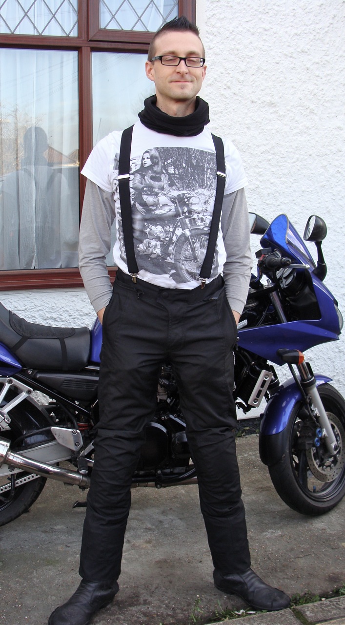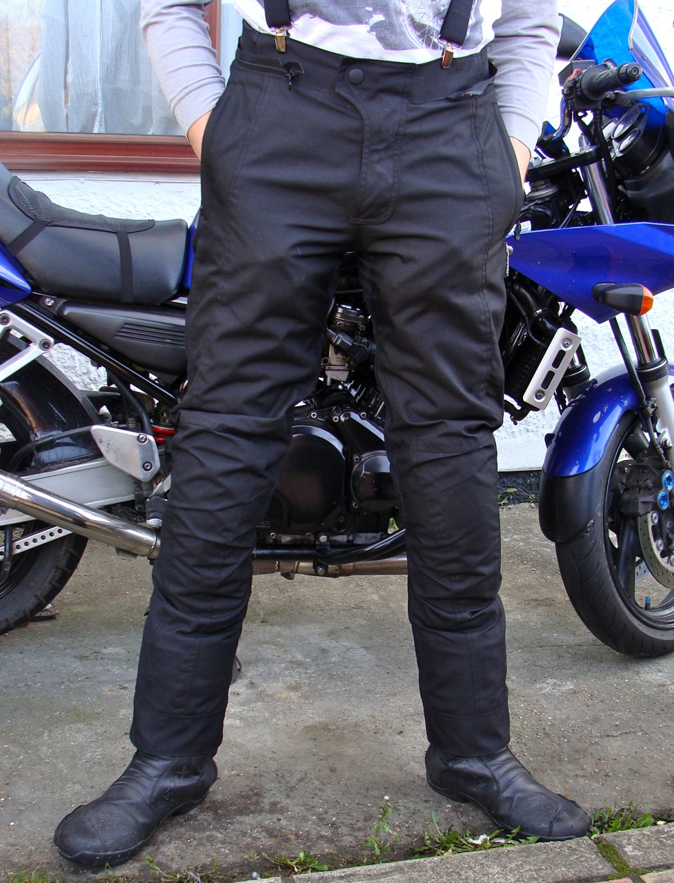 As summer comes to a close and winter approaches, the prospect of wet riding days looms with a damp inevitability. I was fed up with my waterproof over-trousers that were no longer waterproof, and a hassle to put on, as well as causing me to slip around on the seat and more importantly, look pretty naff. Definitely time for some new textile gear. Being a cheapskate, I hit eBay and found these Alpinestars P1 Sport Touring Drystar trousers brand new for £100. They’re not current, but the Drystar range is still going strong and well regarded.