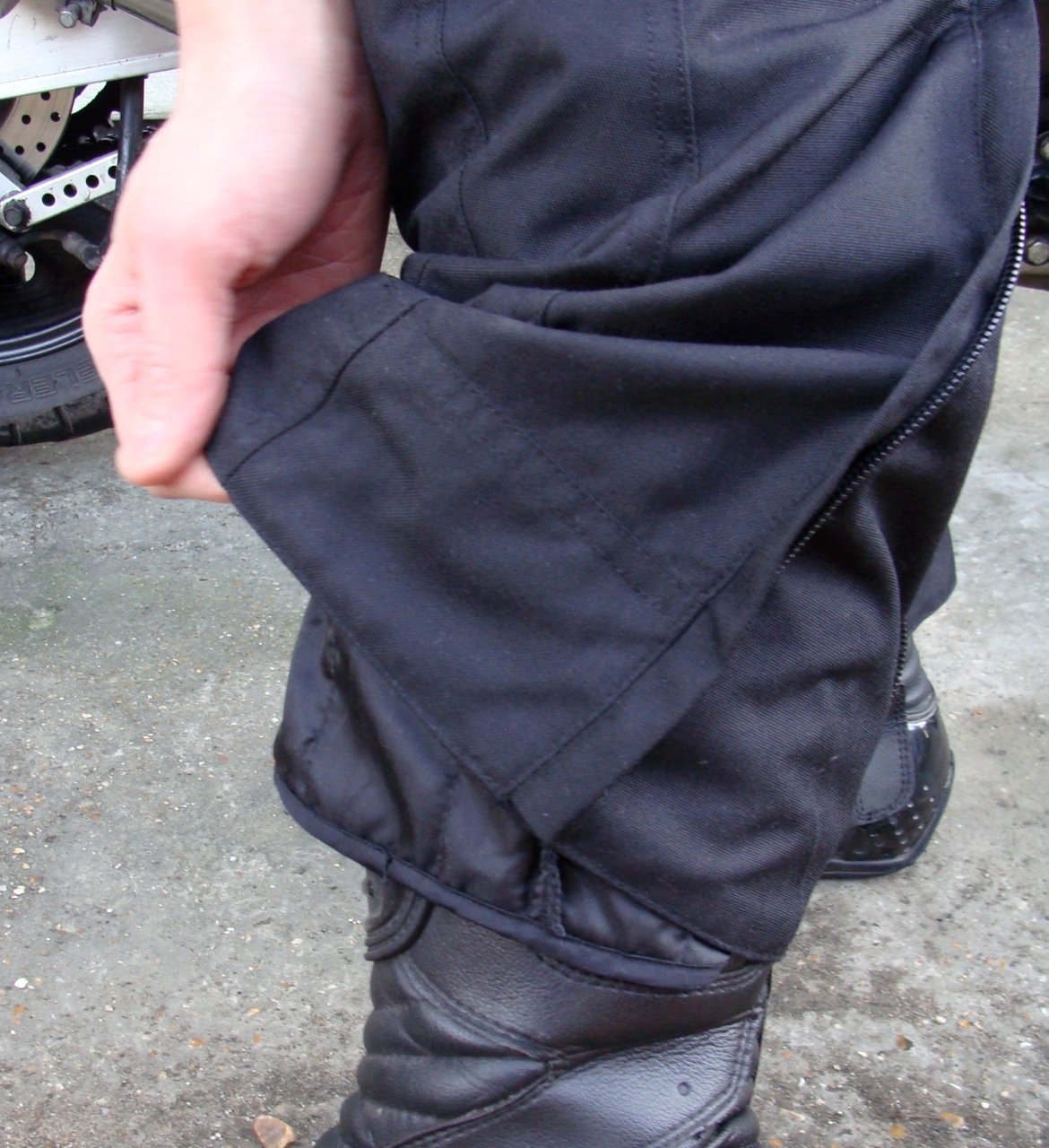 Key features are the 500D Cordura material, which is lightweight and breathable, a fully waterproof Drystar lining (very similar to Gore-Tex), a removable thermal lining, CE knee and hip armour and a long leg over boot cut. I went for a Small size, which suits my 32″ waist pretty well. I normally wear a 30″ waist Levi’s or a Euro 46 Alpinestars leather trousers, the small Drystars, should sit between a 30-32″ waist (Alpinestars size-chart), but were fractionally loose on me. They have just enough length for my 32″ inside leg, zipping over my Alpinestars SMX-4 boots fine.