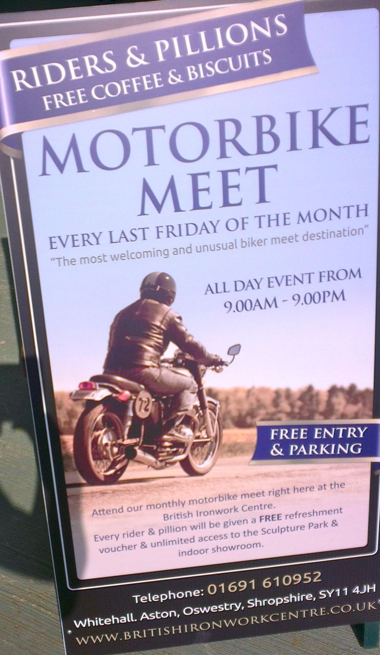 If you’re near Oswestry on the A5 on the last Friday of the month, then check out the British Ironworks Centre. They’re offering free coffee and biscuits for bikers who pop in, perfect for that ride back from the Horseshoe Pas.
