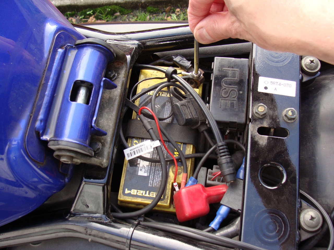 The battery must be disconnected and removed before the bike goes into storage. In cold weather the battery can freeze, causing it to crack and leak an acidic solution over your bike. Once the battery is removed, clean the terminals with a wire brush and lube them with dielectric grease. The battery should be kept in a clean, dry place and charged in a well ventilated area.