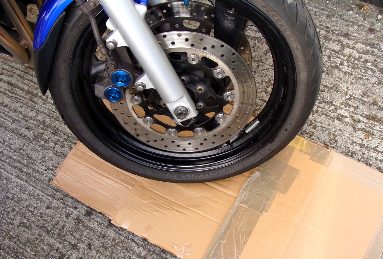 Inflate both tyres to the maximum recommended pressure. If the bike is stood on a concrete or metal floor, place some cardboard underneath the tyres to prevent the rubber from freezing.