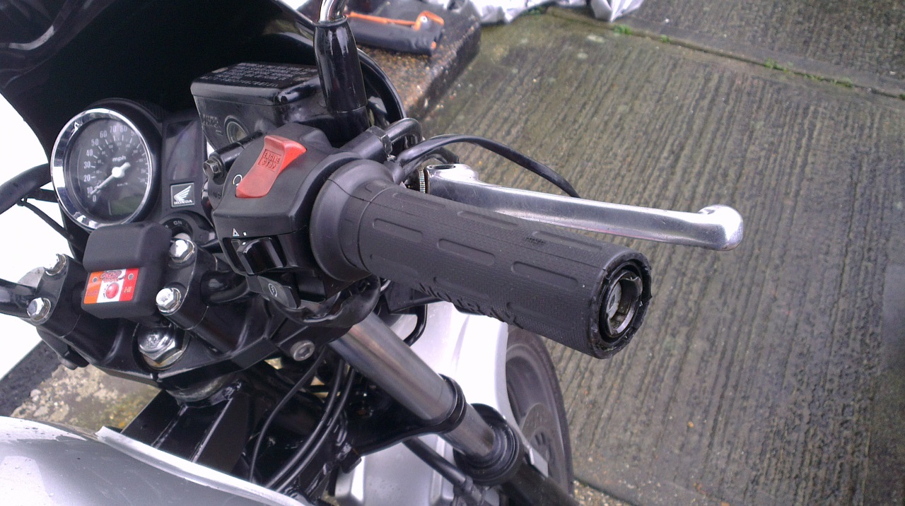 When we bought the CBF500, it came with a cheap set of heated grips fitted, very handy for the winter. However, their installation was critically bodged. The grips were glued on using a rubber-type grip glue, which, although fine whilst the grips were cold, when hot the glue became tacky and no longer adhesive. Thus, when twisting the throttle, the grip would slip around, and not rotate the throttle! To address this, I consulted internet wisdom and opted for the double-sided carpet tape method.