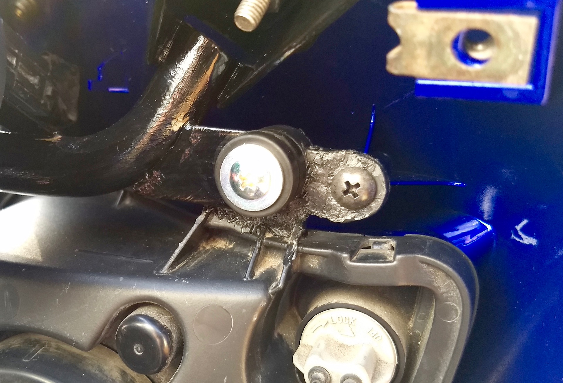 The result, although not pretty was perfectly functional. It’s not on show, hidden by the fairing and plenty strong enough to mount the fairing to light cluster and in turn lights to brackets. The buried staples and built up plastic provide a good deal of strength. Overall a cheap and easy way to repair expensive plastic parts.