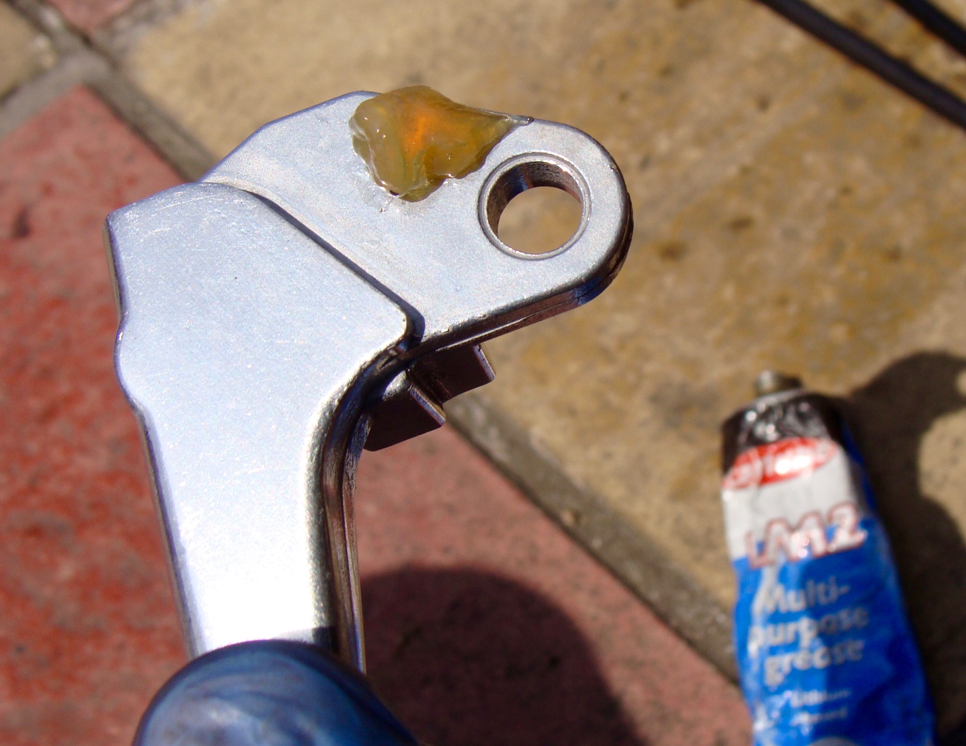 I recently noticed my clutch lever had a load of excessive free play in it, which I pinpointed to the hole on the lever having worn oval causing slack and reducing leverage. With the clutch cable removed from the lever as per above, it’s simply a case of undoing the top bolt and swapping a new lever in with some grease.