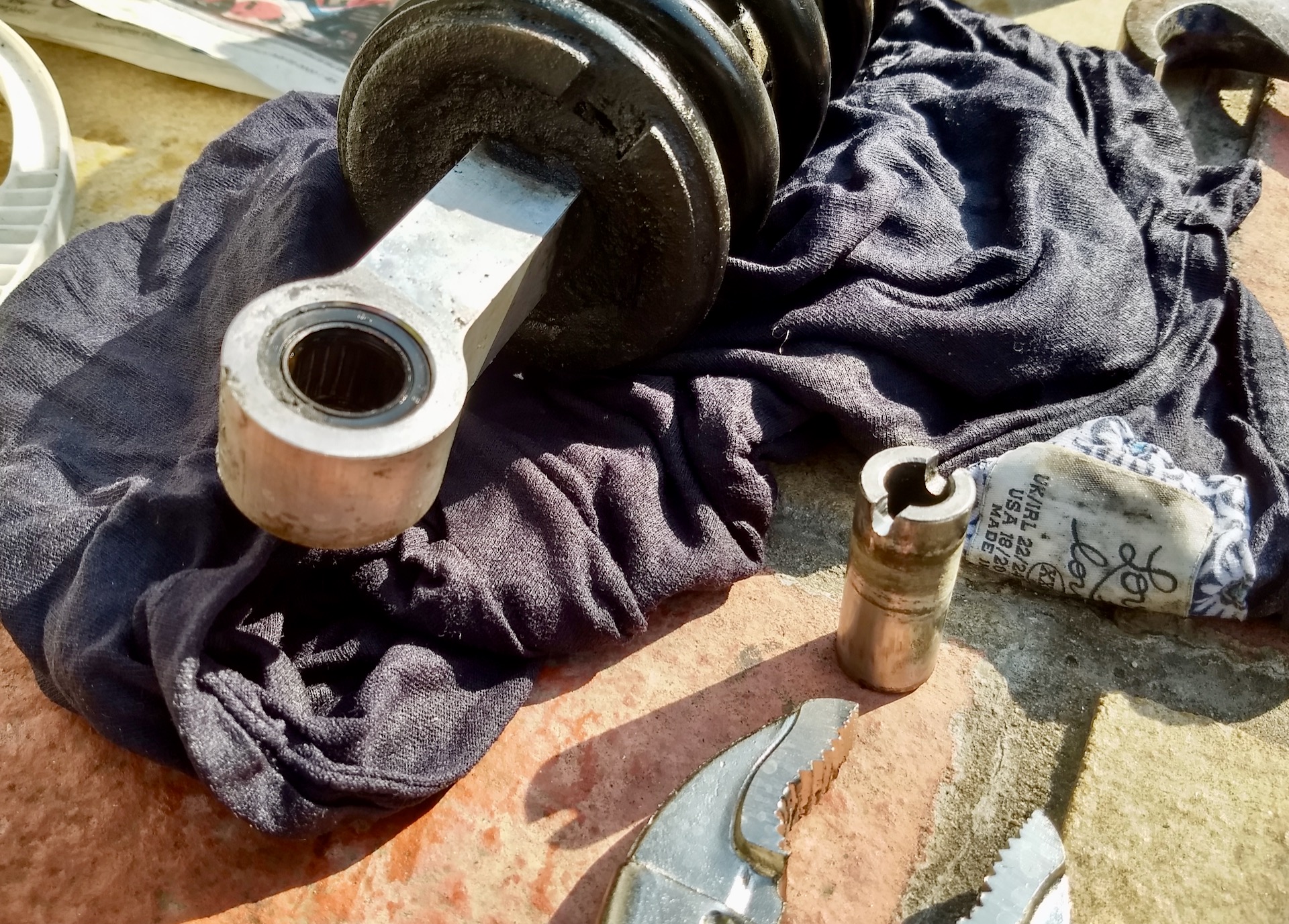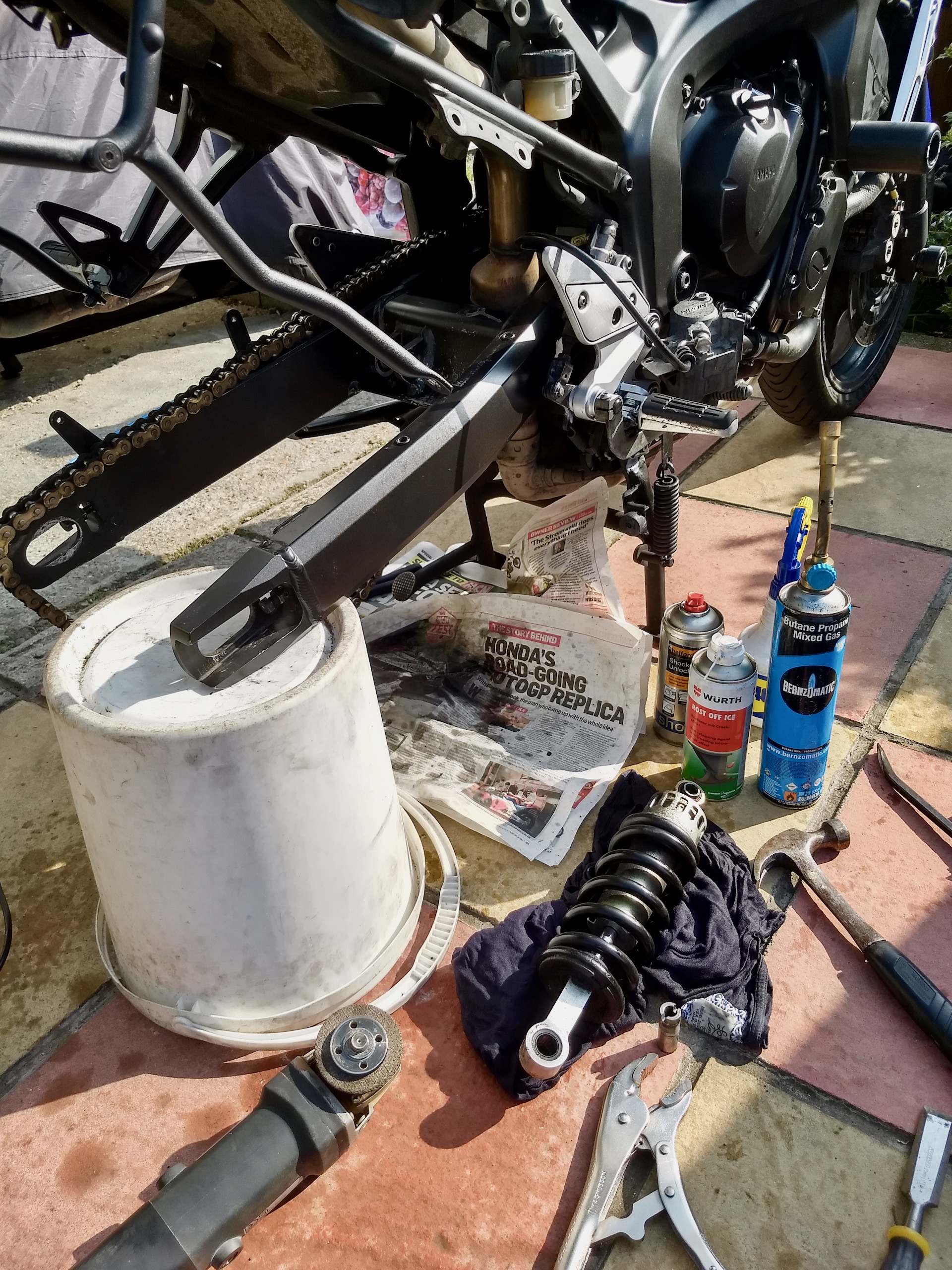 The FZ6 rear shock is secured by a bolt at the bottom but has a rod through the swingarm mount and shock lower bearing that provides the main support. This rod, as is commonly the case, was seized in place, has little to get purchase on it and there’s no access to bash it out from the other side. After trying all the lubes, anti-seize sprays, moll grips, heat etc, I had to resort to angle grinding a slot at the end of the rod to give me some purchase for a drift bar and big hammer (see right-hand pic above). I was then finally able to get the rod to rotate slightly and eventually loosen enough to remove with moll grips. Once removed, everything else was straight forward and the new Nitron shock bolted on with no hassle.