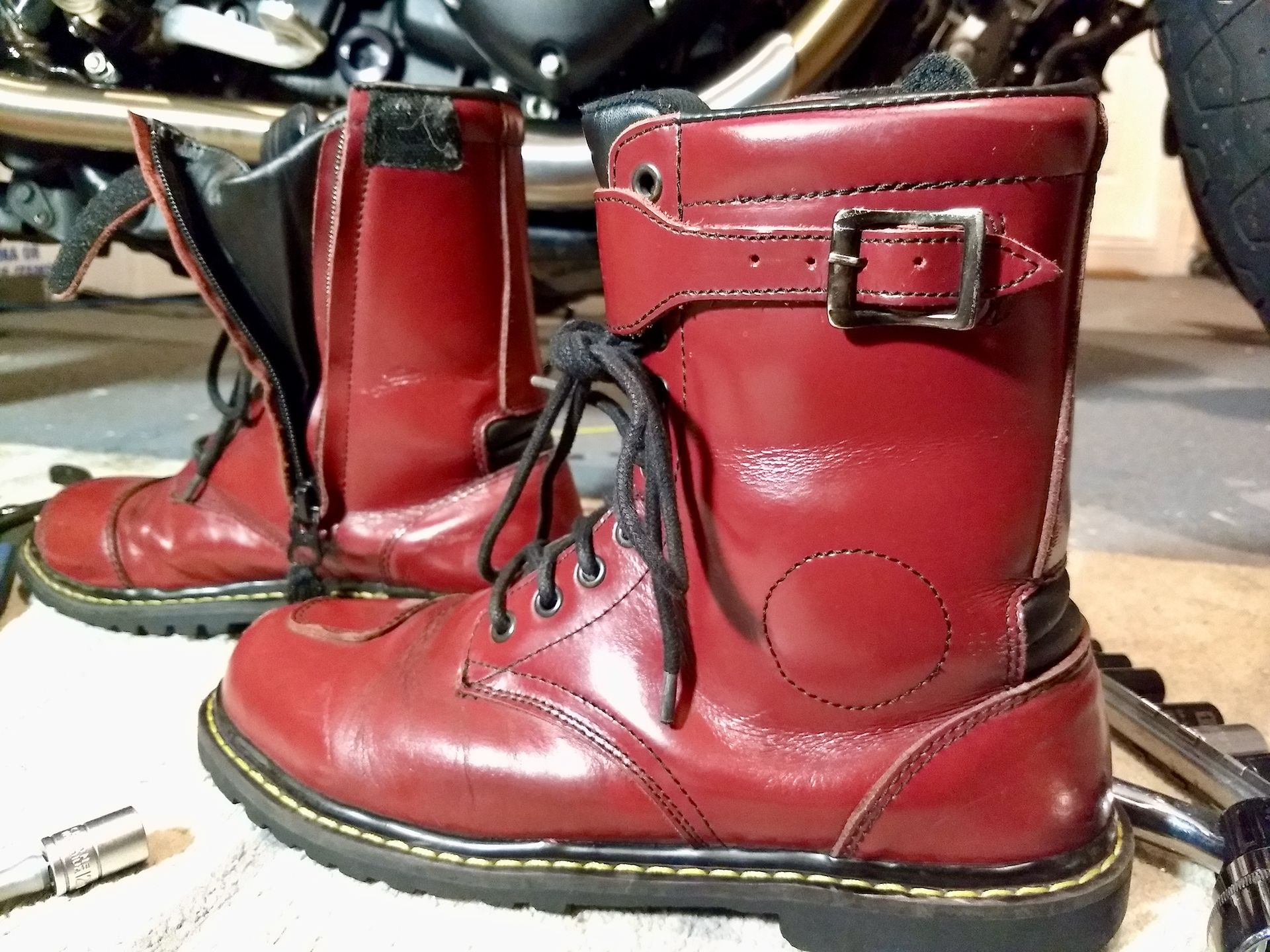 First impressions? Oh honey, they’re serving looks. If you’ve ever had a soft spot for that classic cherry-red lace-up vibe, you’ll clock it immediately. They’ve got that rebellious, slightly scuffed, “I’ve seen things” aesthetic—like they belong equally on a bike or kicking through a sticky pub floor. A bit lighter in tone than the old-school cherry reds you might be thinking of, but still bold enough to say, “Yes, I ride, and no, I’m not here to blend in.”