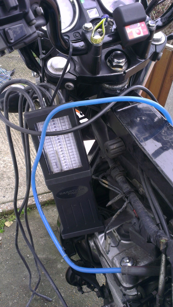 The Morgan Carbtune tool makes easy work of balancing. The most difficult thing on the Fazer is finding the adjustment screws buried deep between the carbs. They’re almost impossible to see and you just have to poke a long screwdriver down into the engine and guess where they are!